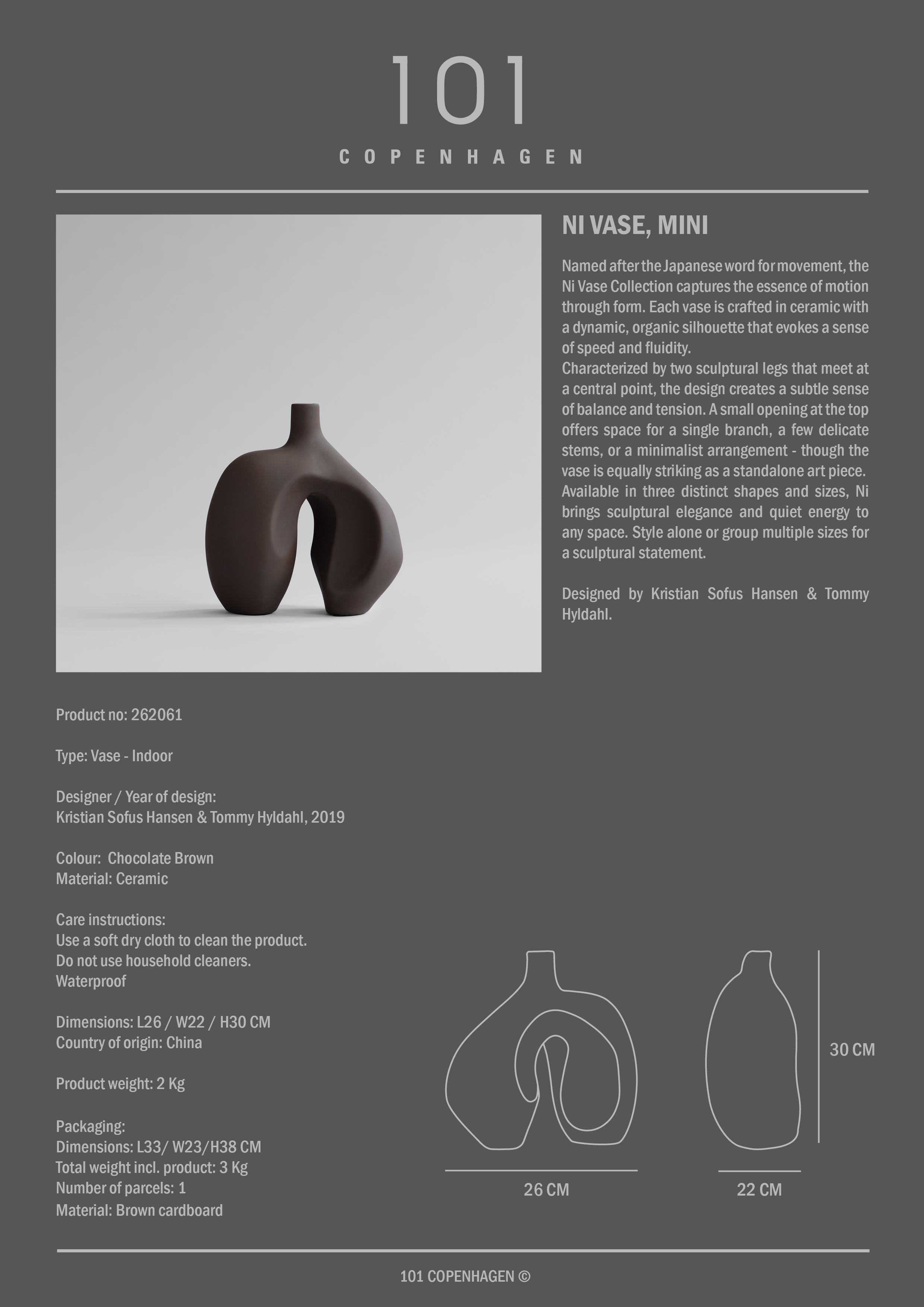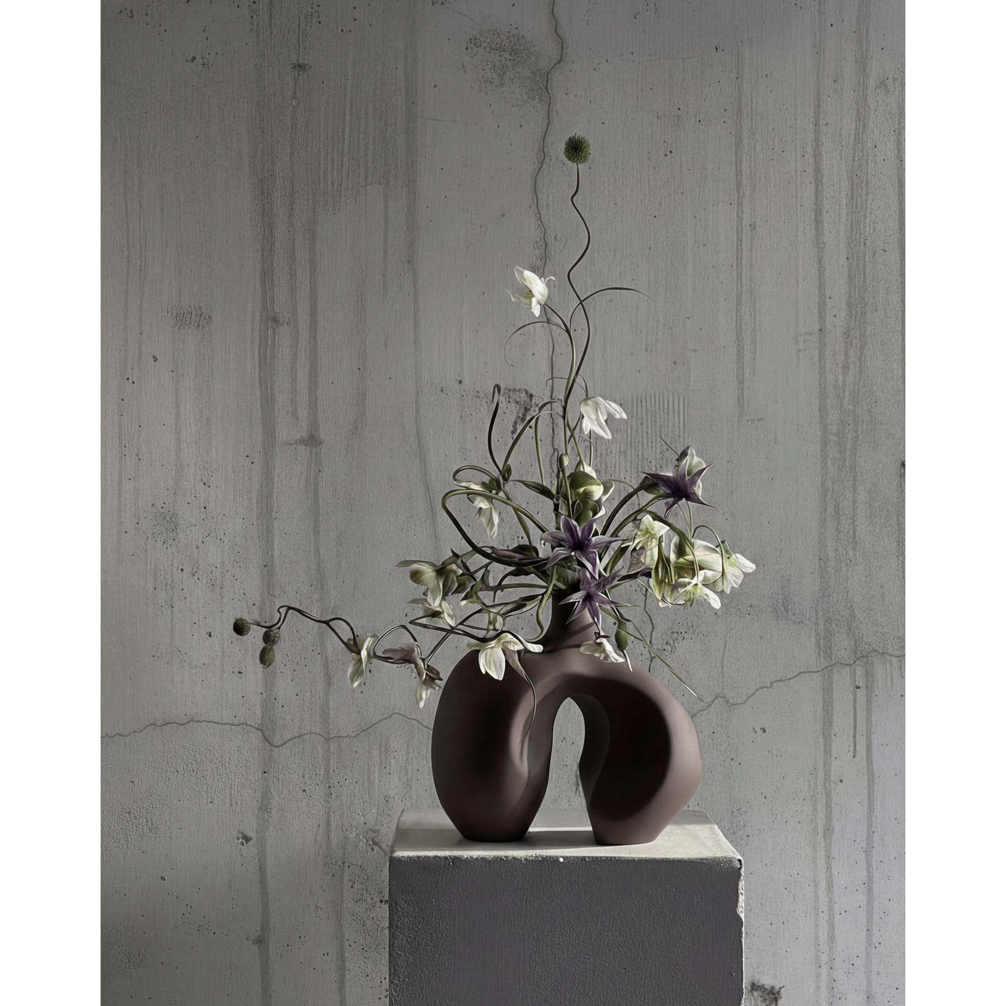 La colección Ni toma su nombre de la palabra japonesa para movimiento y narra la historia de una forma capturada en silencio. Cada objeto nace de arcilla moldeada a mano y se moldea en siluetas orgánicas que parecen vivas, como si se detuvieran a medio paso. Las formas y curvas invitan a la mente a flotar sobre el agua o al movimiento de una bailarina en el espacio. Las esculturales patas se unen en un delicado punto de equilibrio, otorgando a los objetos una presencia casi humana. Vista desde diferentes ángulos, la forma cambia de carácter y revela nuevas tensiones y líneas, mientras que la estrecha abertura invita a composiciones sencillas o a dejar que el objeto se destaque como una declaración artística.