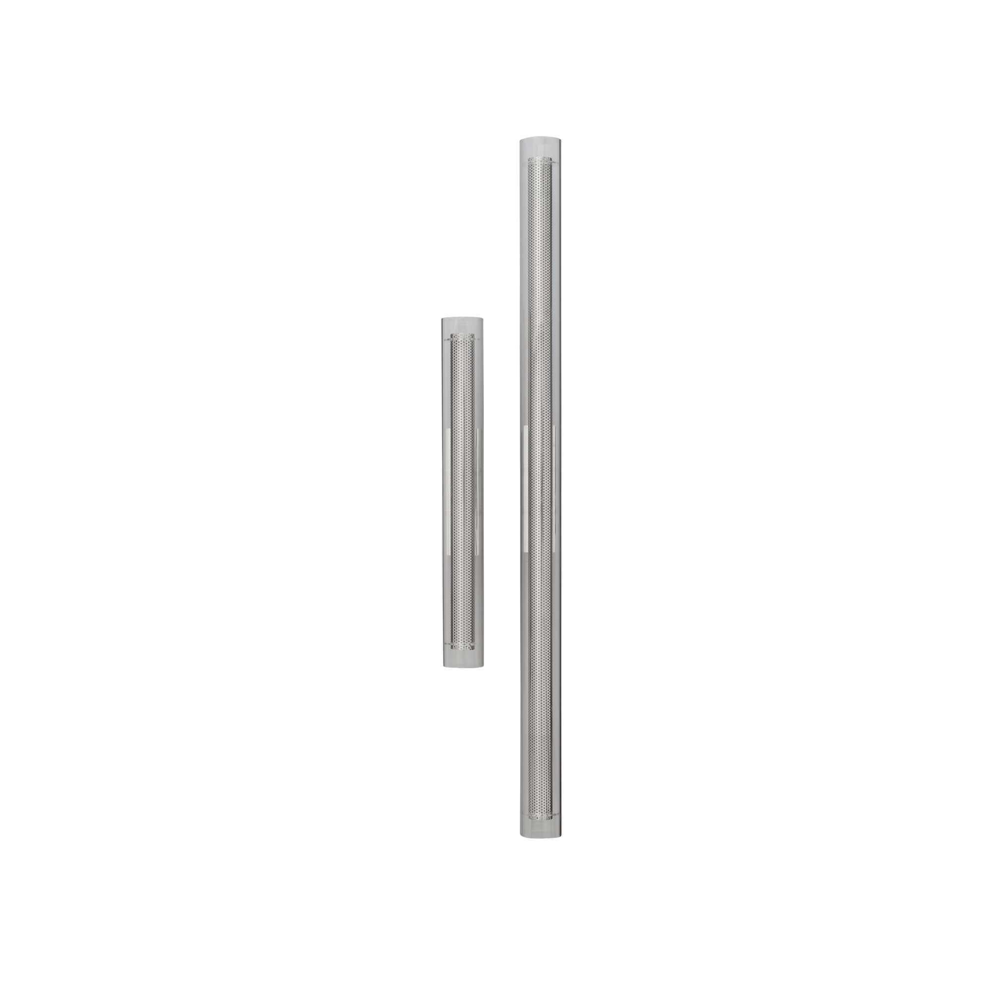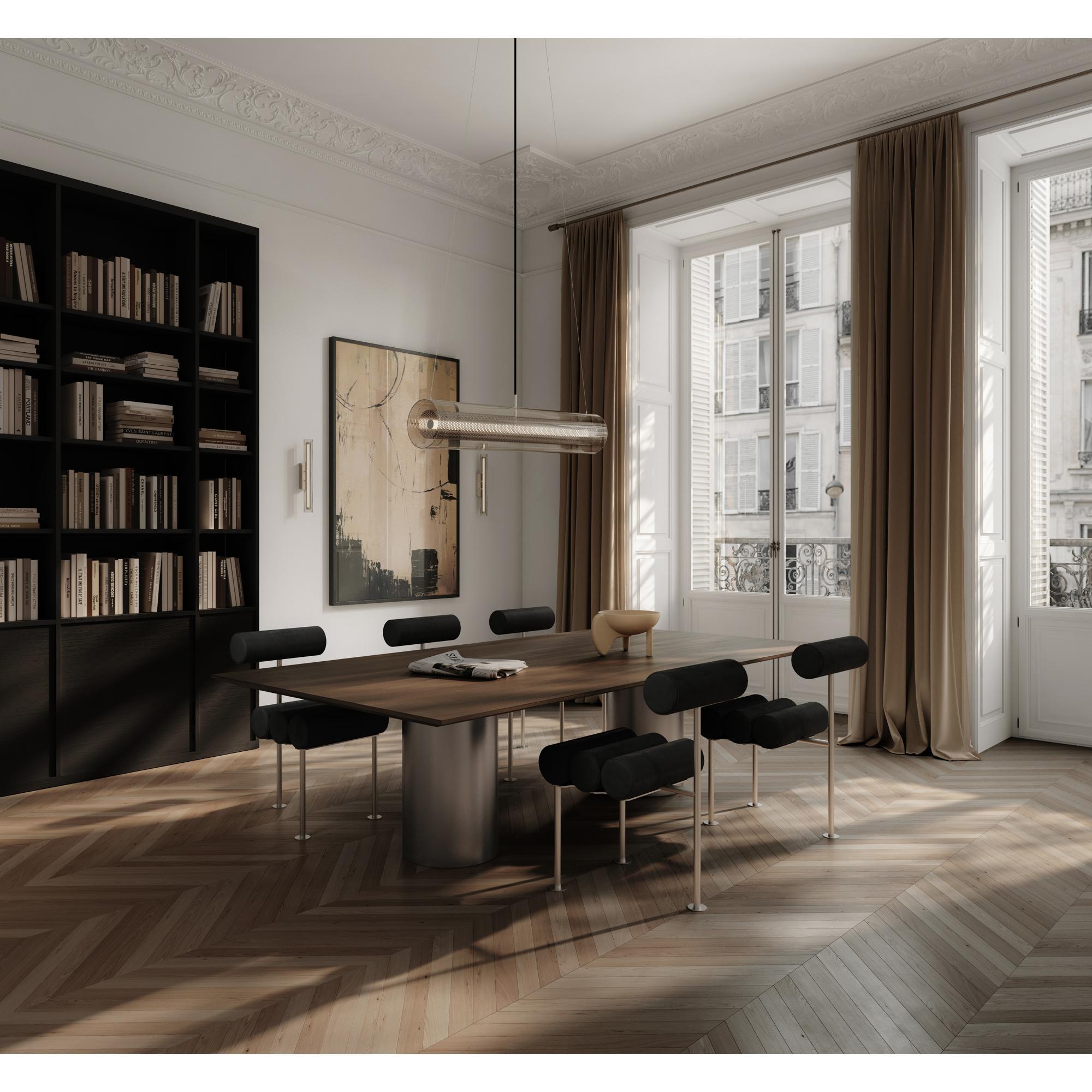 Frame es una serie de iluminación que se centra en enmarcar la bombilla mediante la combinación de capas de materiales contrastantes. El metal perforado adquiere un aspecto más suave gracias a una capa exterior de vidrio transparente con extremos redondeados, creando un equilibrio entre nitidez y suavidad. La bombilla LED integrada, oculta en un vidrio acrílico blanco, distribuye la luz uniformemente y crea una cálida luz que realza la profundidad del diseño. La serie está disponible como lámparas de pared en dos tamaños: 50 cm y 100 cm, como lámpara colgante de 100 cm y como la lámpara colgante Frame Fat, de mayor diámetro para una expresión más impactante. Frame combina un estilo industrial con una elegancia sutil y crea una experiencia de iluminación atmosférica. Diseño de Kristian Sofus Hansen y Tommy Hyldahl.