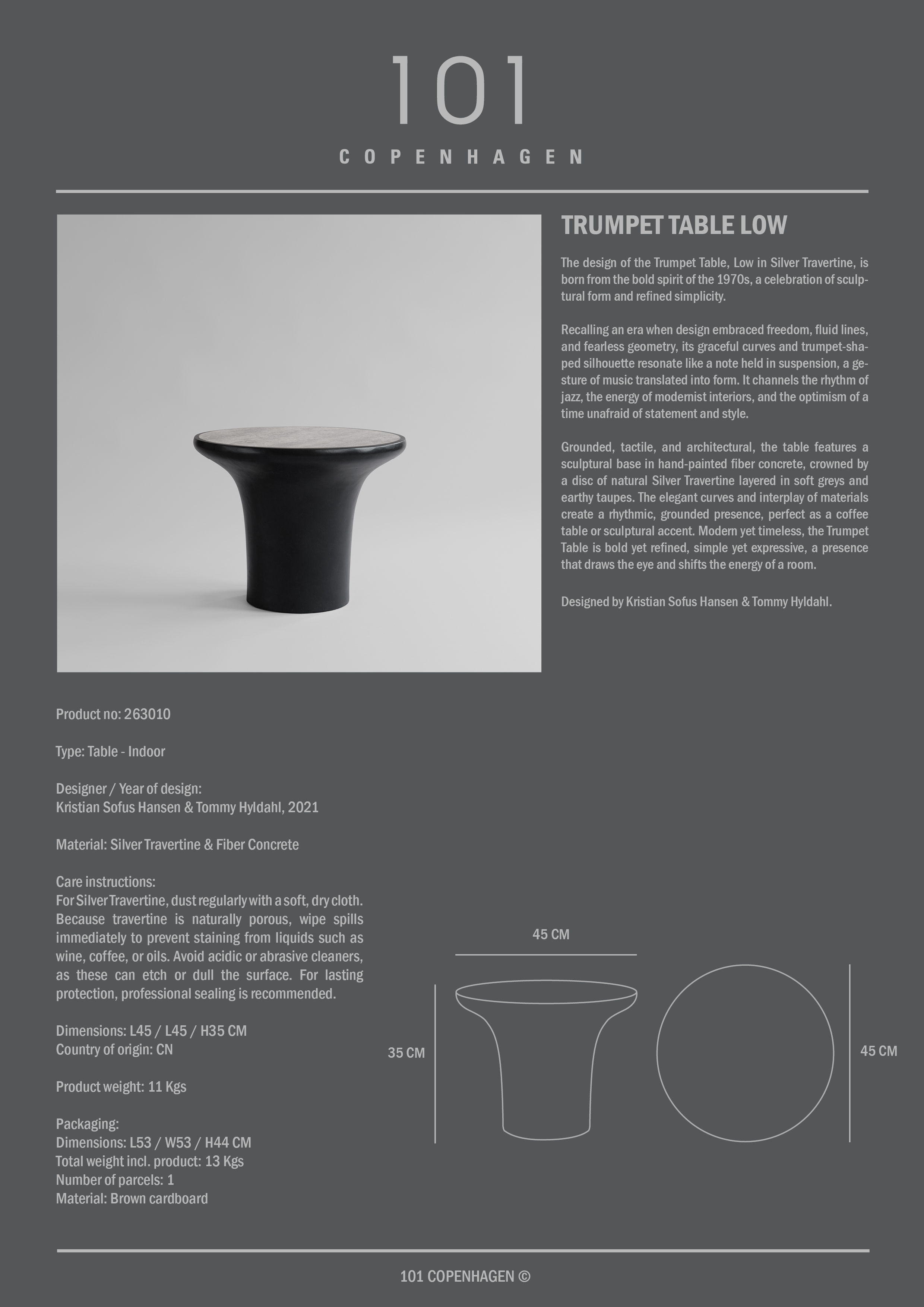 Mesa Auxiliar Baja de Trompeta 101 Copenhagen en Travertino Plata 449 € Igualamos el precio en directo Listo para entrega en 30–40 días Añadir a la cestaConoce más información del producto Envío gratuito en pedidos superiores a 150 € Excluye muebles grandes y otros productos seleccionados Derecho de devolución de 365 días Distribuidor autorizado